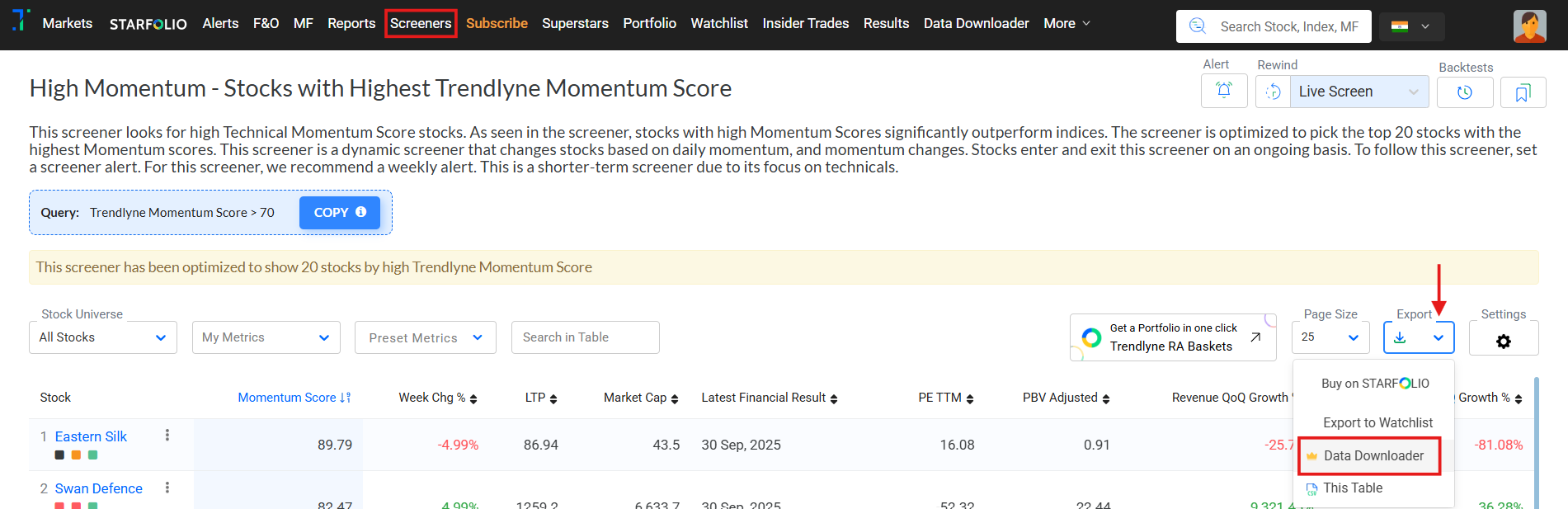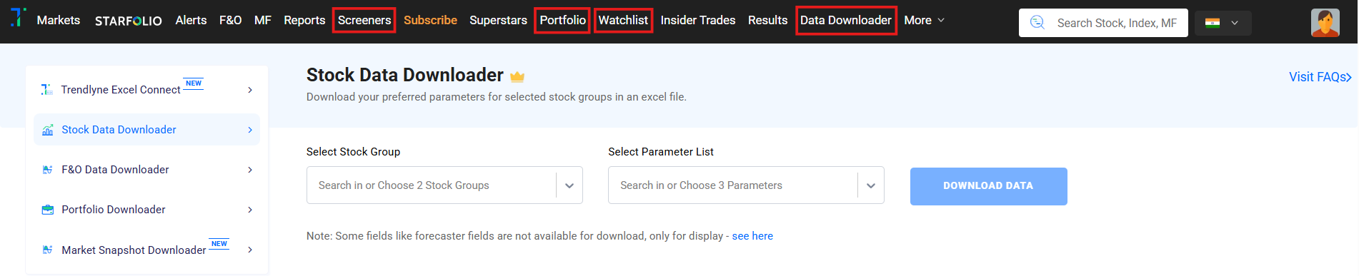 Alternatively, you can access the ‘Data Downloader’ from the Screeners, Portfolio, or Watchlist sections.