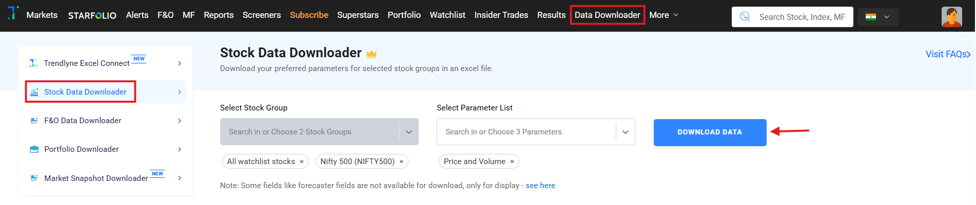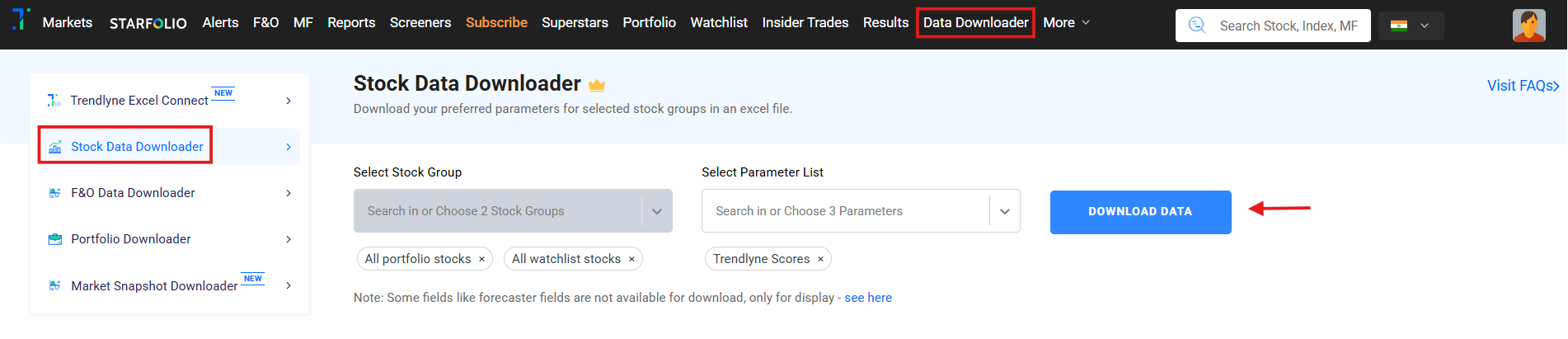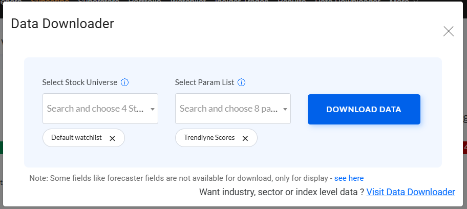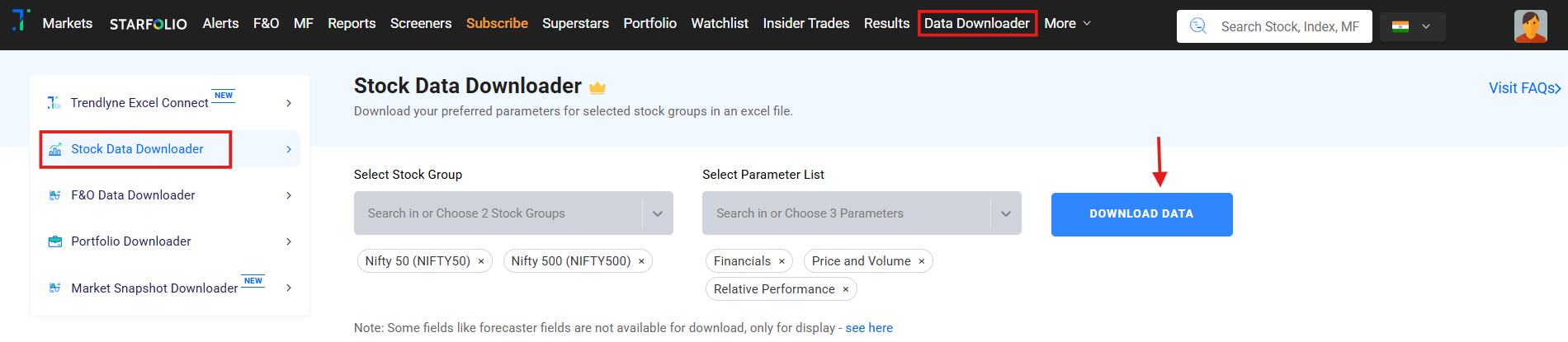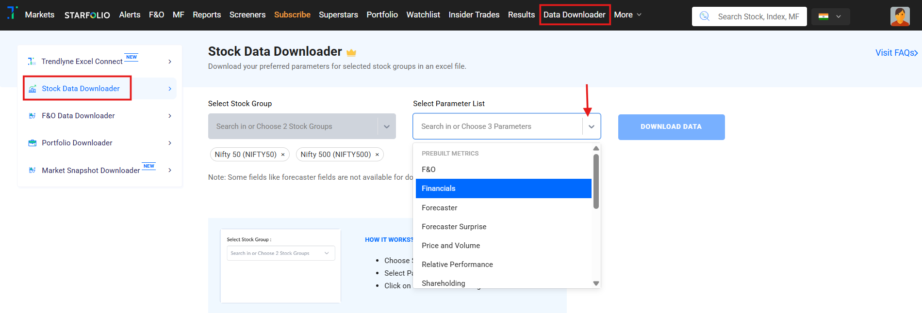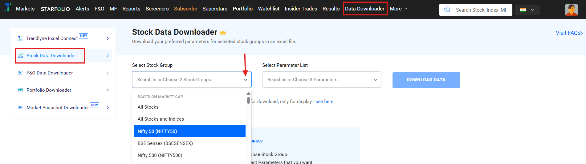 Navigate to 'Data Downloader' from the 'Export' menu, choose your stock groups and parameters, and click 'Download Data' to save your file, as illustrated below.
