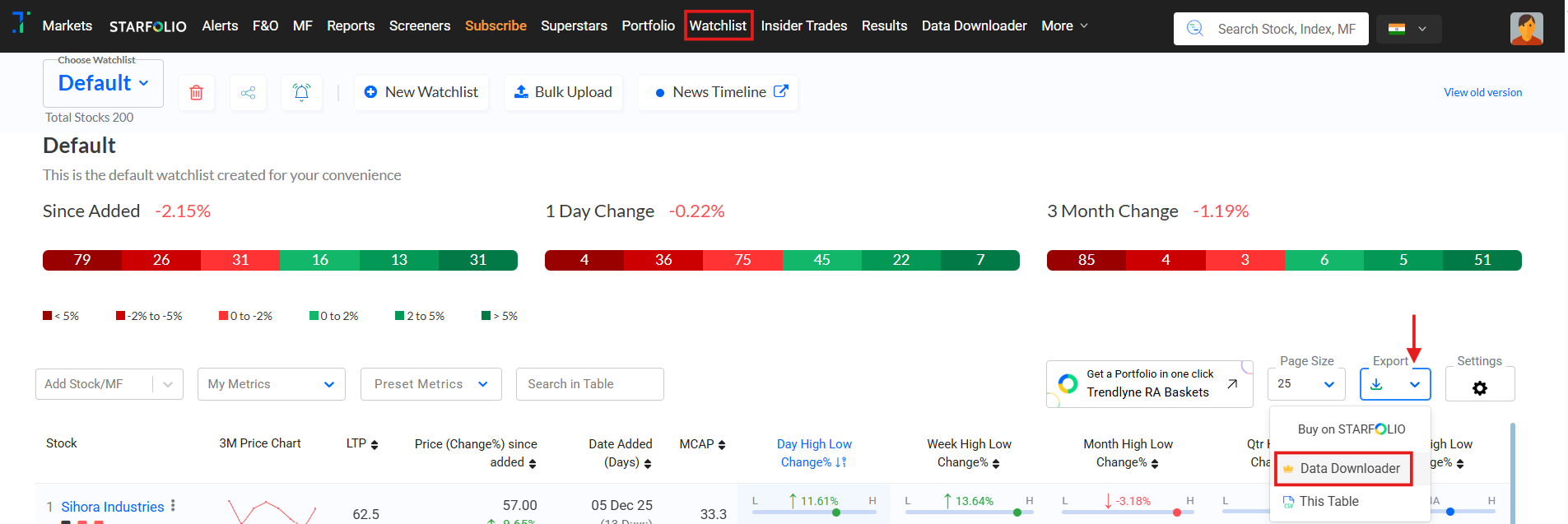 The steps to download data using this feature are the same across Screeners, Portfolios, or Watchlists.