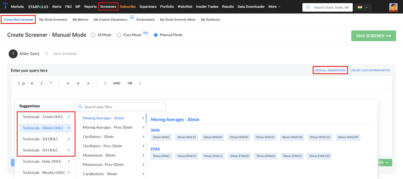Intraday Screeners: Now track intraday moves with categories like Positive/Negative Technicals, Price and Volume breakouts, and Bullish/Bearish Candlestick patterns, all designed to catch short-term trends