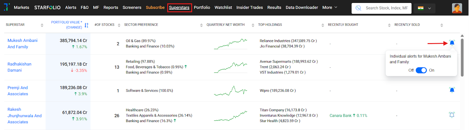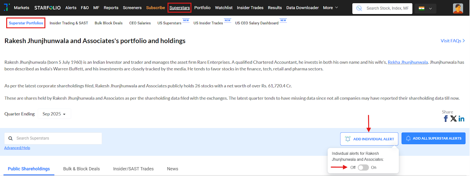 Click Add Individual Alert, and use the toggle to enable or disable alerts for that superstar (for example, Rakesh Jhunjhunwala and Associates’s portfolio).