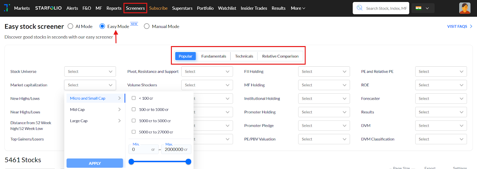 Discover great stocks in seconds! No complex setup needed. Our new easy stock screener lets you easily filter using fundamental, technical, and comparative parameters in drop down mode, all in one screen.
