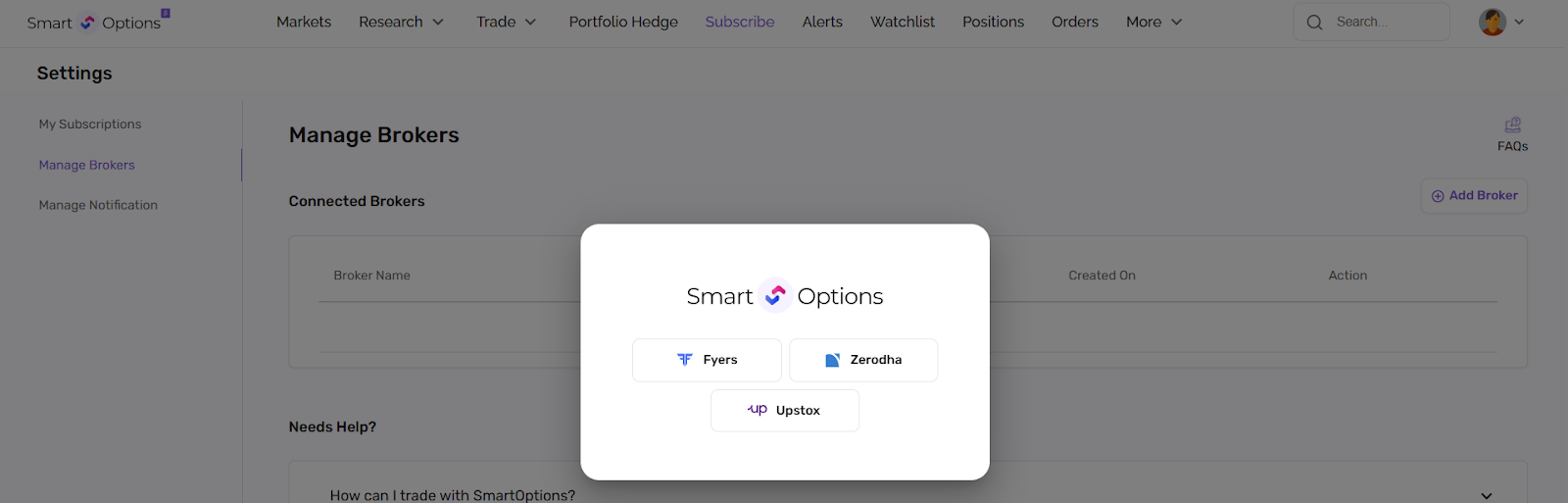 Manage your connected brokers here: https://smartoptions.trendlyne.com/settings/manage-brokers/