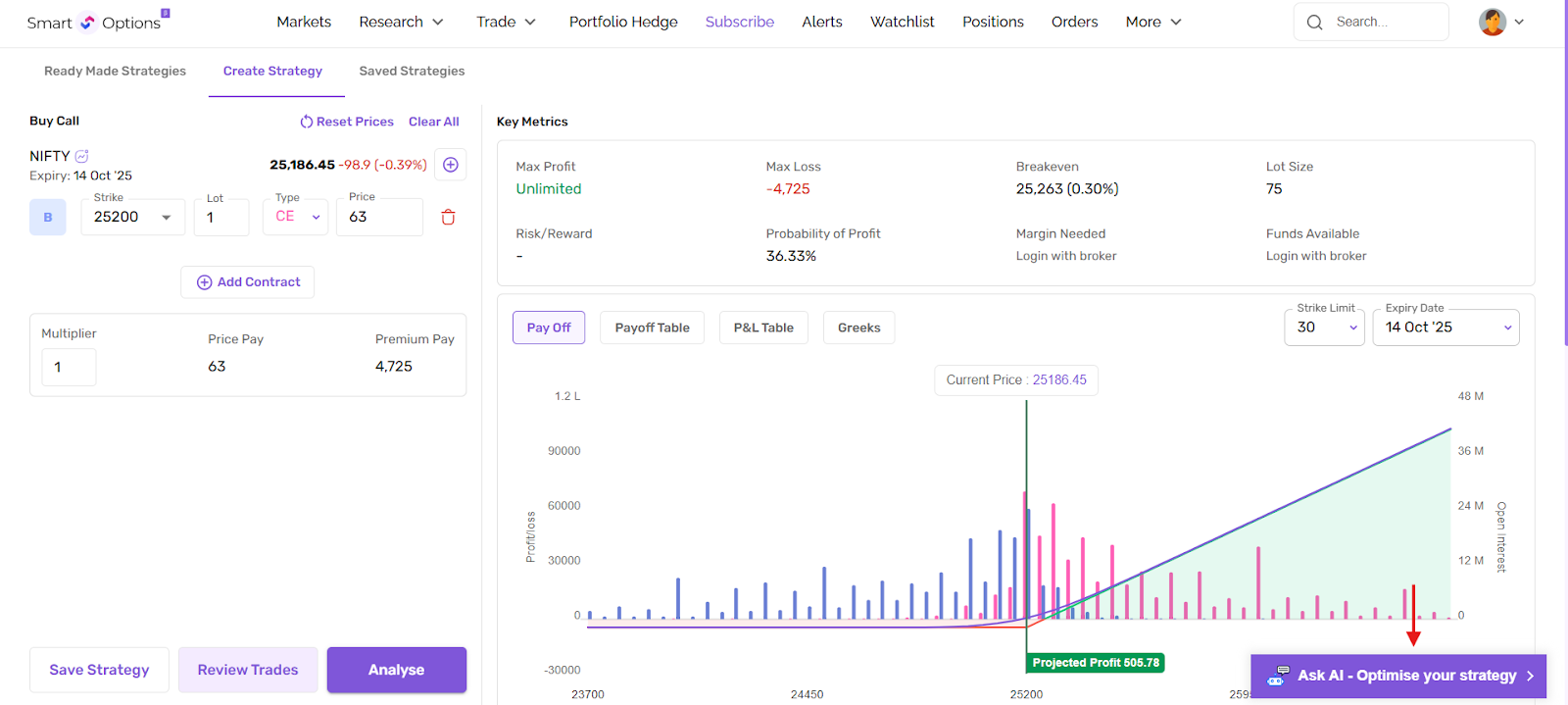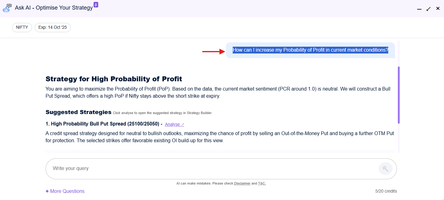 Once you select a strategy, click Ask AI - Optimise Your Strategy and type your query. The AI gives fast, personalized insights for both simple and complex setups.
