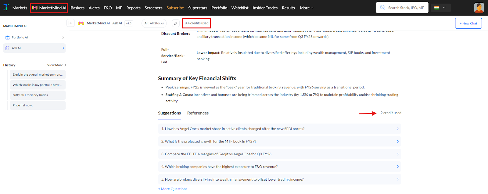 MarketMind AI credits are consumed based on the type and complexity of the query.